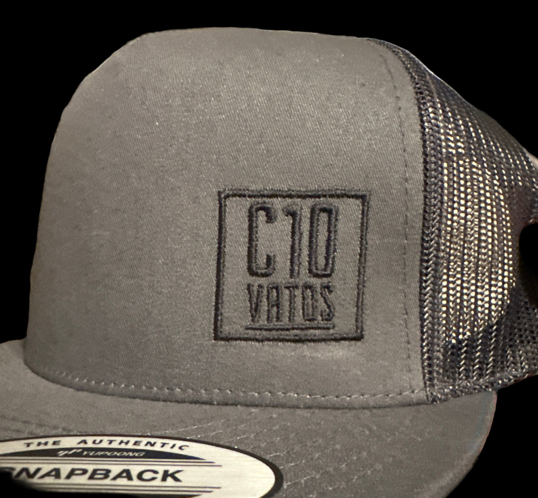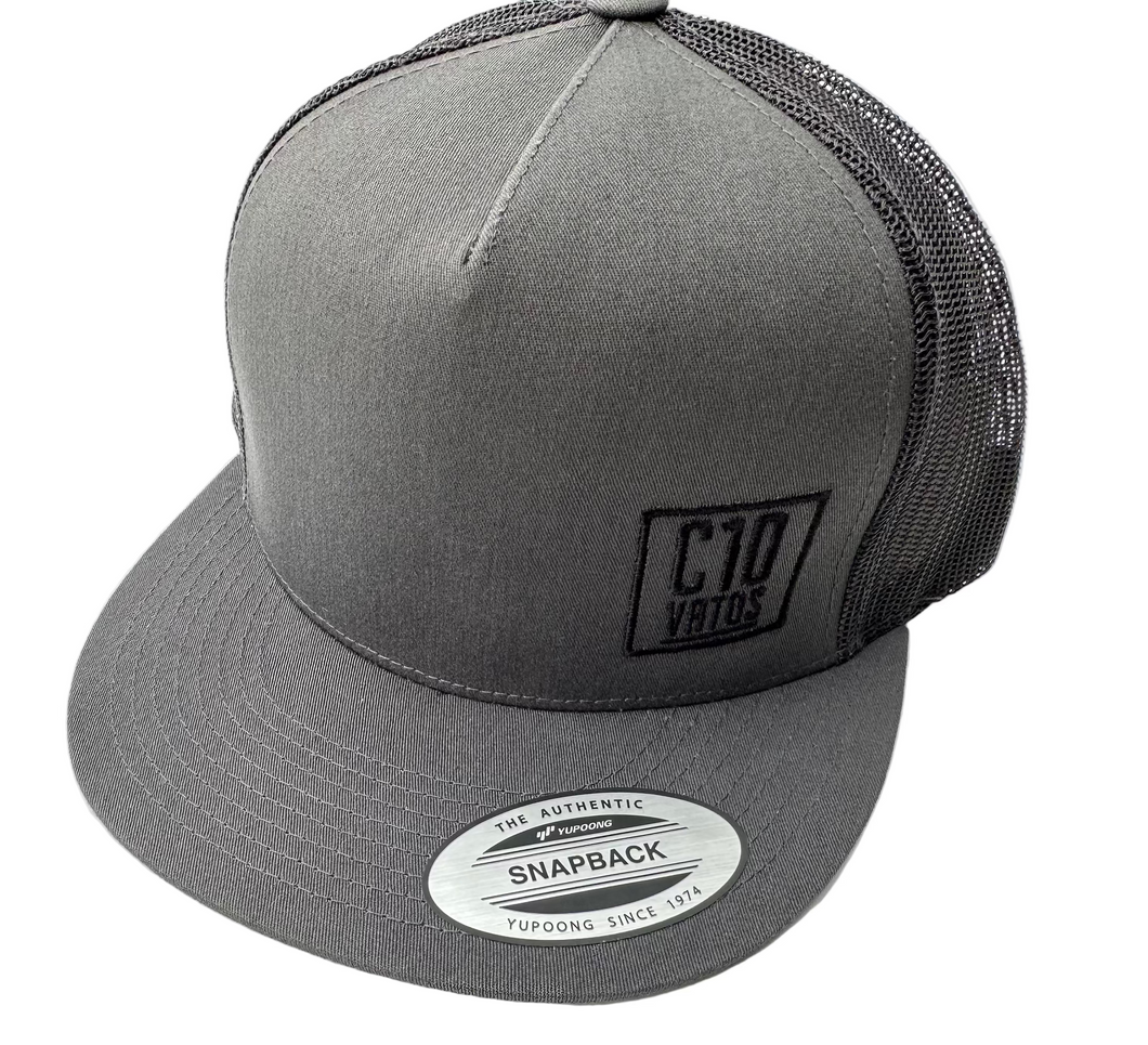 SnapBack truck hat. Grey in color with black square logo